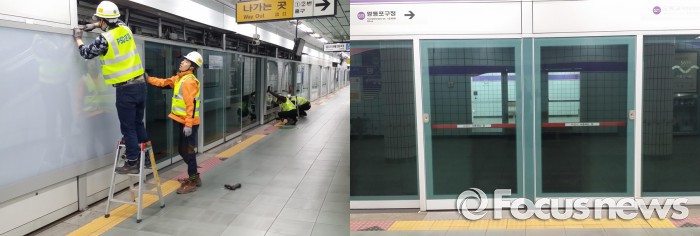 김태호 서울도시철도공사 사장은 "지하철 안전에 대한 시민들의 우려를 줄이기 위해 비상시 승객들이 신속하게 탈출할 수 있도록 고정문을 비상문으로 교체하는 작업을 올해부터 본격화한다"며 "예산 문제를 해결하기 위해 다양한 방법을 강구 중이지만 공사의 재원만으로는 사실상 한계가 있는 만큼 시민안전 확보를 위해 정부에서 적극적인 재정지원을 검토해주기를 바란다"고 말했다.서울지하철 5호선 양평역 스크린도어에 설치됐던 광고판을 제거하는 모습(왼쪽)과 광고판 제거 후 모습. <사진제공=서울시청>