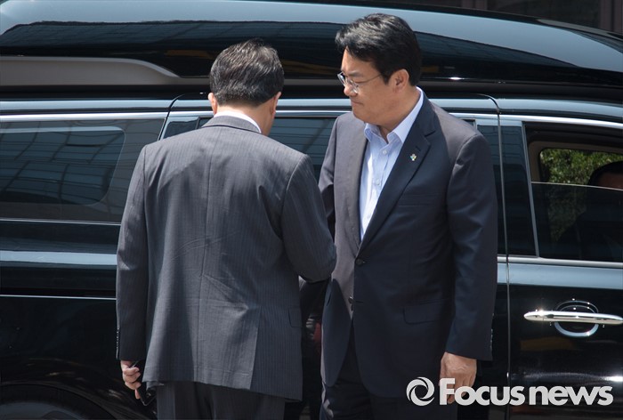(서울=포커스뉴스) 정진석(오른쪽) 새누리당 원내대표가 17일 오후 서울 여의도 한 음식점에서 비공개 오찬약속을 위해 이동하며 권성동 사무총장과 대화하고 있다.