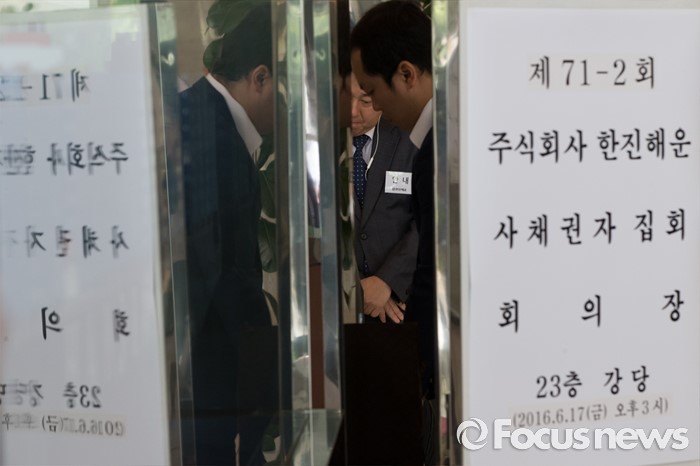 (서울=포커스뉴스) 17일 오후 서울 영등포구 한진해운 본사에서 한진해운 사채권자 집회 참석자들이 접수를 하고 있다.