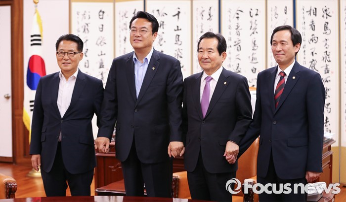 정 의장은 이날 국회 접견실에서 새누리당 정진석 원내대표와 더불어민주당 우상호 원내대표, 국민의당 박지원 원내대표와 비공개 회동을 가지고 국회 현안에 대해 1시간 가까이 논의를 진행했다.