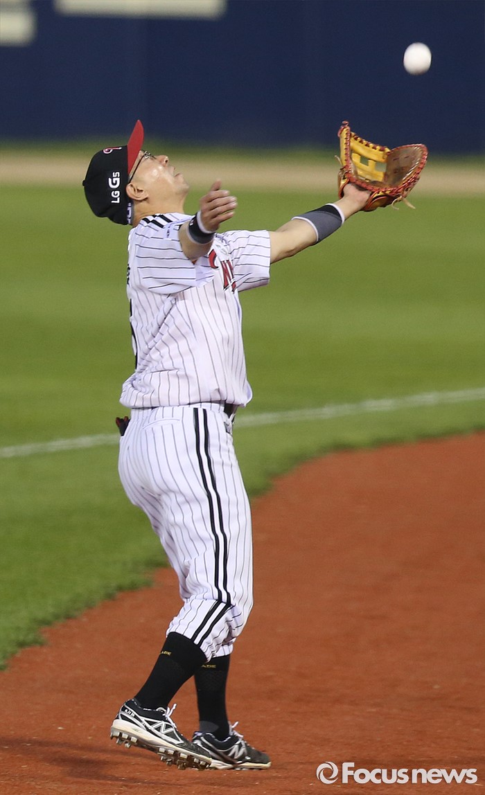 (서울=포커스뉴스) 17일 서울 잠실구장에서 열린 2016 프로야구 KIA-LG 경기 5회초 2사 2루에서 LG 1루수 정성훈이 KIA 이범호의 파울 타구를 워닝트랙에서 잡으려 글러브를 뻗어 내밀고 있다.