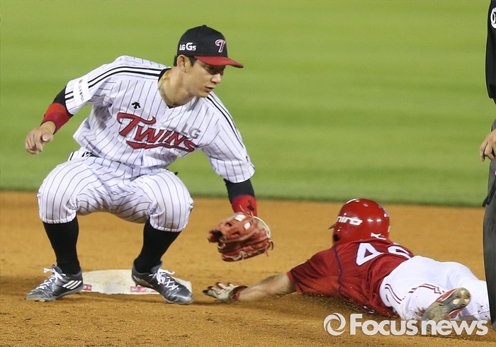 (서울=포커스뉴스) 17일 서울 잠실구장에서 열린 2016 프로야구 KIA-LG 경기 9회초 무사 1루에서 KIA 1루 대주자 박찬호가 나지완의 볼넷때 2루에 슬라이딩해 들어가고 있다.