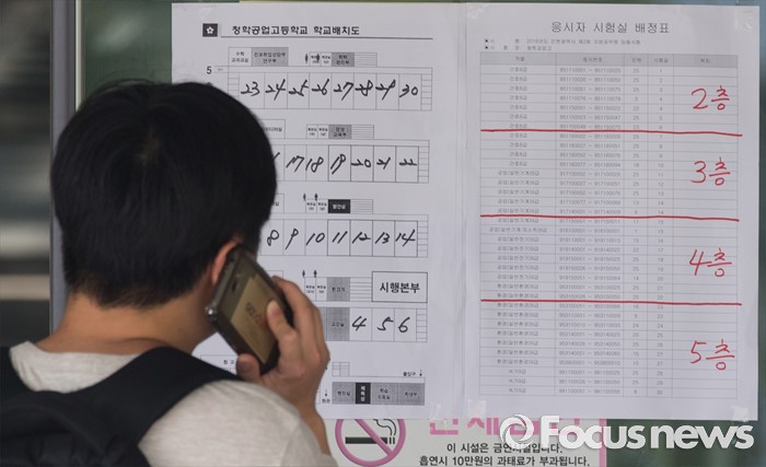 (인천=포커스뉴스) 2016년 제2회 지방공무원 임용 필기시험이 실시된 18일 오전 인천 연수구 청학공업고등학교에서 한 수험생이 시험실을 확인하고 있다.
