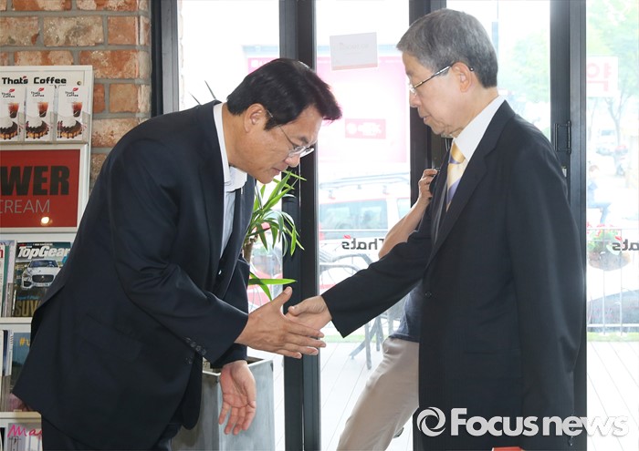(서울=포커스뉴스) 김희옥 새누리당 혁신비상대책위원장과 정진석 원내대표가 19일 오전 서울 강남구 논현동 한 카페에서 비상대책위원회 정상화를 위한 회동을 하고 있다. 이번 회동은 지난 16일 탈당 무소속 의원들의 일괄복당을 결정한 혁신비대위 회의 과정에 불만을 제기하고 김 위원장이 칩거에 들어간지 나흘째 전격적으로 이뤄진 회동이다.
