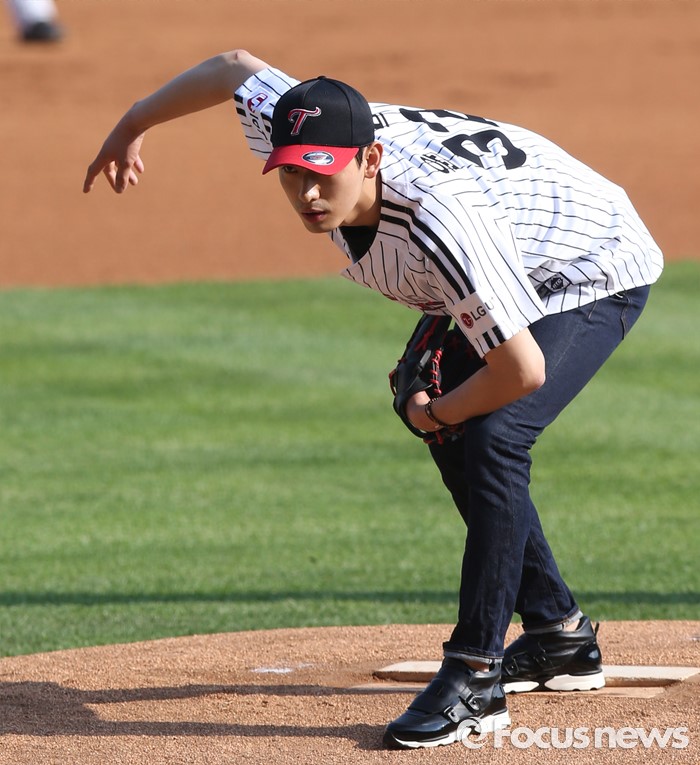 (서울=포커스뉴스) 19일 서울 잠실구장에서 열린 2016 프로야구 KIA-LG 경기에 앞서 배우 윤박이 시구하며 독특한 자세를 취하고 있다.