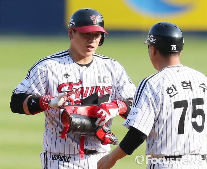 (서울=포커스뉴스) 19일 서울 잠실구장에서 열린 2016 프로야구 KIA-LG 경기 2회말 1사 1루에서 LG 정상호가 주자를 홈으로 불러 들이는 2루타를 치고 한혁수 코치에게 레그 가드를 넘기고 있다.