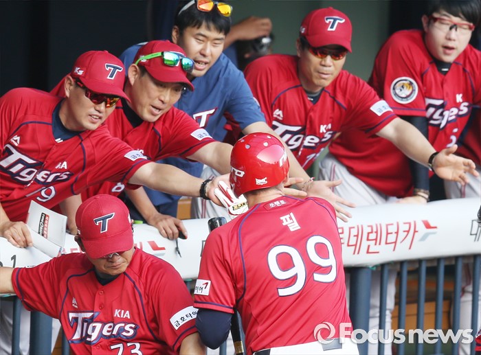 (서울=포커스뉴스) 19일 서울 잠실구장에서 열린 2016 프로야구 KIA-LG 경기 5회초 1사후 KIA 필이 좌월 솔로 홈런을 치고 덕아웃에서 동료들의 축하를 받고 있다.