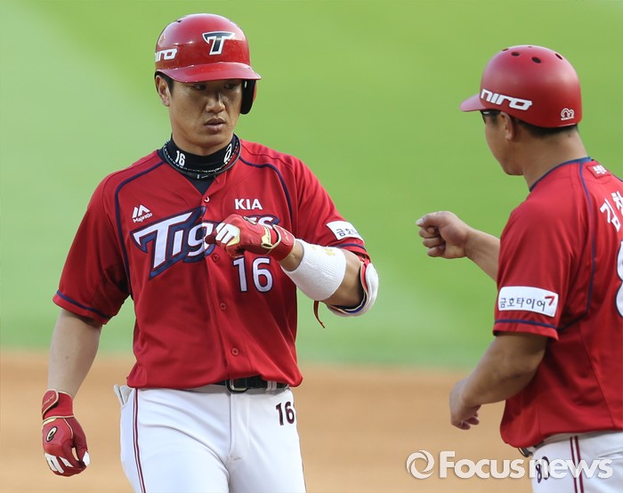(서울=포커스뉴스) 19일 서울 잠실구장에서 열린 2016 프로야구 KIA-LG 경기 6회초 1사 1,3루에서 KIA 김주찬이 역전 1타점 좌전 안타를 치고 1루에서 김창희 코치의 축하를 받고 있다.
