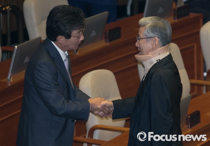 (서울=포커스뉴스) 20일 오전 서울 여의도 국회에서 열린 343회 국회(임시회) 3차 본회의에 참석한 유승민(왼쪽), 여상규 새누리당 의원이 인사하고 있다.