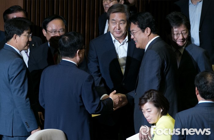 (서울=포커스뉴스) 20일 오전 서울 여의도 국회에서 열린 343회 국회(임시회) 3차 본회의에 참석한 정진석 새누리당 원내대표가 교섭단체 대표연설을 마친 뒤 김무성 전 대표, 유승민 의원 등과 악수하고 있다.