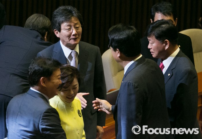 한편, 친박계 의원들은 이날 오후 2시 의원회관에 모여, 권성동 사무총장의 경질 논란과 복당 문제 등에 대한 대책을 논의한다.20일 오전 서울 여의도 국회에서 열린 343회 국회(임시회) 3차 본회의에 참석한 정진석 새누리당 원내대표가 교섭단체 대표연설을 마친 뒤 유승민 의원과 악수하고 있다. 2016.06.20 박동욱 기자