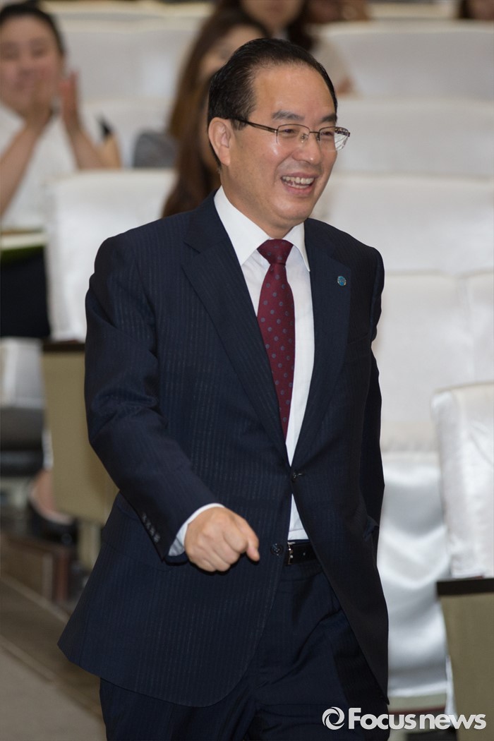 (서울=포커스뉴스) 20일 오전 서울 서초구 한국교원단체총연합회에서 열린 제36대 한국교총 회장선거 개표 및 당선자 발표에서 회장으로 선출된 하윤수 부산교대 총장이 들어서고 있다.