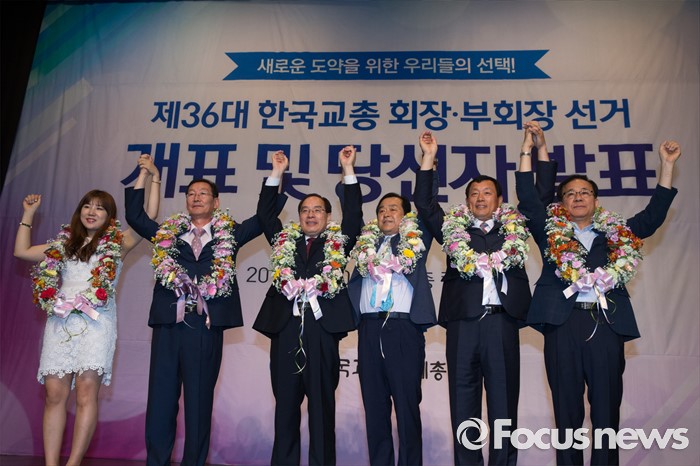 (서울=포커스뉴스) 20일 오전 서울 서초구 한국교원단체총연합회에서 열린 제36대 한국교총 회장선거 개표 및 당선자 발표에서 회장으로 선출된 하윤수(왼쪽 세번째) 부산교대 총장과 신임부회장단이 기념촬영을 하고 있다.