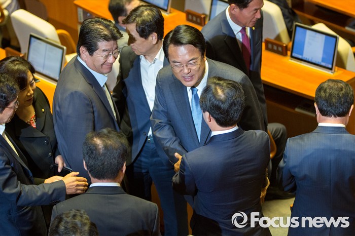 (서울=포커스뉴스) 정진석 새누리당 원내대표가 20일 오전 서울 여의도 국회에서 열린 본회의에 참석해 교섭단체 대표 연설을 마친 뒤 동료 의원들과 악수 하고 있다.