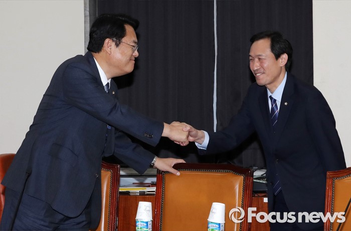 (서울=포커스뉴스) 20일 오후 서울 여의도 국회에서 열린 정보위원회 전체회의에 참석한 정진석(왼쪽) 새누리당 원내대표와 우상호 더불어민주당 원내대표가 악수하고 있다.