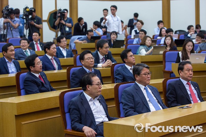(서울=포커스뉴스) 조원진(오른쪽 두 번째) 새누리당 의원을 비롯한 친박계 초재선 의원들이 20일 오후 서울 여의도 국회의원회관에 모여 간담회 시작을 기다리고 있다.
