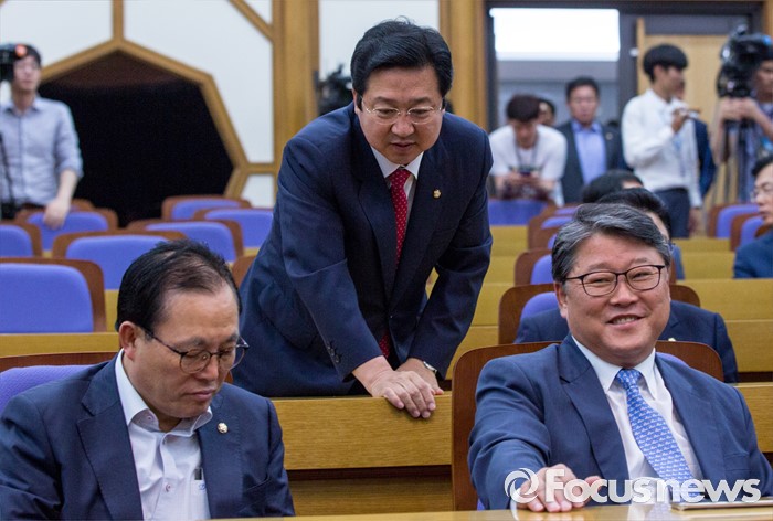(서울=포커스뉴스) 이장우(가운데) 새누리당 의원이 조원진(오른쪽) 새누리당 의원, 이우현 새누리당 의원과 20일 오후 서울 여의도 국회의원회관에서 열린 친박계 초-재선 의원 모임에 참석해 대화를 나누고 있다.