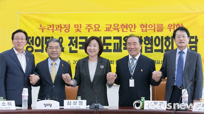 | △ 교육감들과 손 잡은 심상정 상임대표 |