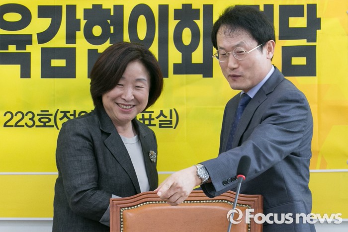 (서울=포커스뉴스) 심상정(왼쪽) 정의당 상임대표가 20일 오후 서울 여의도 국회에서 전국시도교육감협의회와 간담회에 앞서 조희연 서울시교육감과 인사하고 있다.
