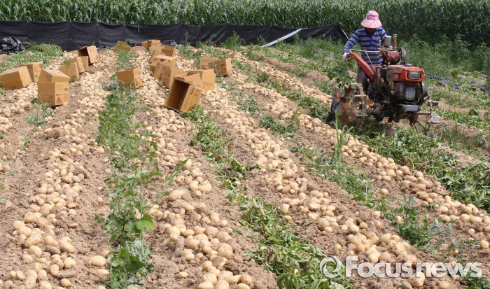 (괴산-포커스뉴스) 장마철을 앞두고 20일 오후 충북 괴산군 들녘에서 농민들이 감자를 수확하고 있다.