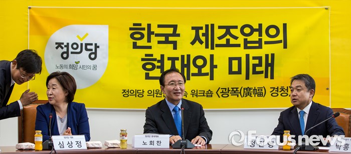 (서울=포커스뉴스) 심상정(왼쪽) 정의당 상임공동대표, 노회찬(가운데) 정의당 원내대표, 정진행 현대자동차 사장이 21일 오전 서울 여의도 국회에서 열린 '정의당 광폭경청'에 참석 하고 있다.