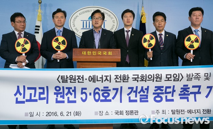 (서울=포커스뉴스) 21일 오전 서울 여의도 국회 정론관에서 탈핵·에너지전환 국회의원 모임이 신고리 원전 5, 6호기 건설 중단 촉구 기자회견을 하고 있다. 왼쪽부터 서형수, 김영춘, 우원식, 김해영 더불어민주당 의원, 윤종오 무소속 의원, 박재호 더불어민주당 의원.
