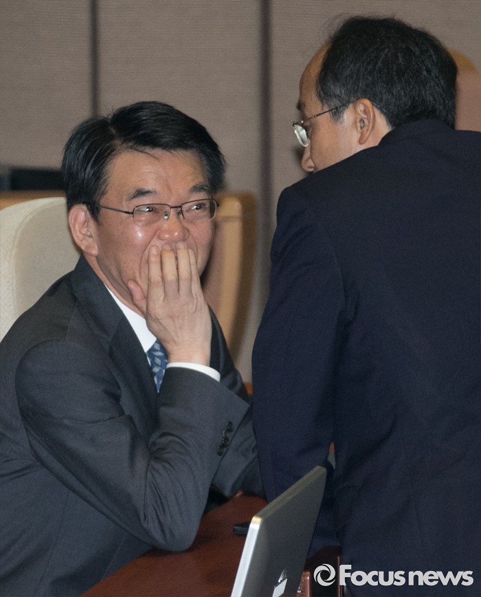 (서울=포커스뉴스) 21일 오전 서울 여의도 국회에서 열린 343회 국회(임시회) 4차 본회의에 참석한 강호인(왼쪽) 국토교통부 장관과 추경호 새누리당 의원이 대화하고 있다.