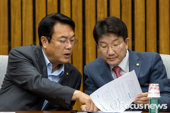 | △ 원내대책회의서 대화 나누는 정진석-권성동 |