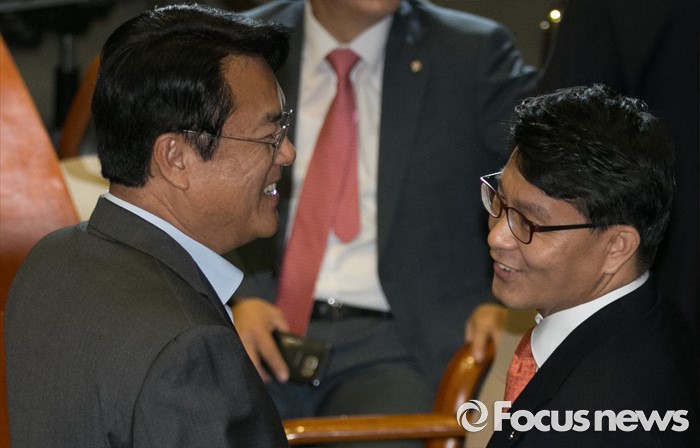 (서울=포커스뉴스) 21일 오전 서울 여의도 국회에서 열린 343회 국회(임시회) 4차 본회의에 참석한 정진석(왼쪽) 새누리당 원내대표와 윤상현 의원이 인사하고 있다.