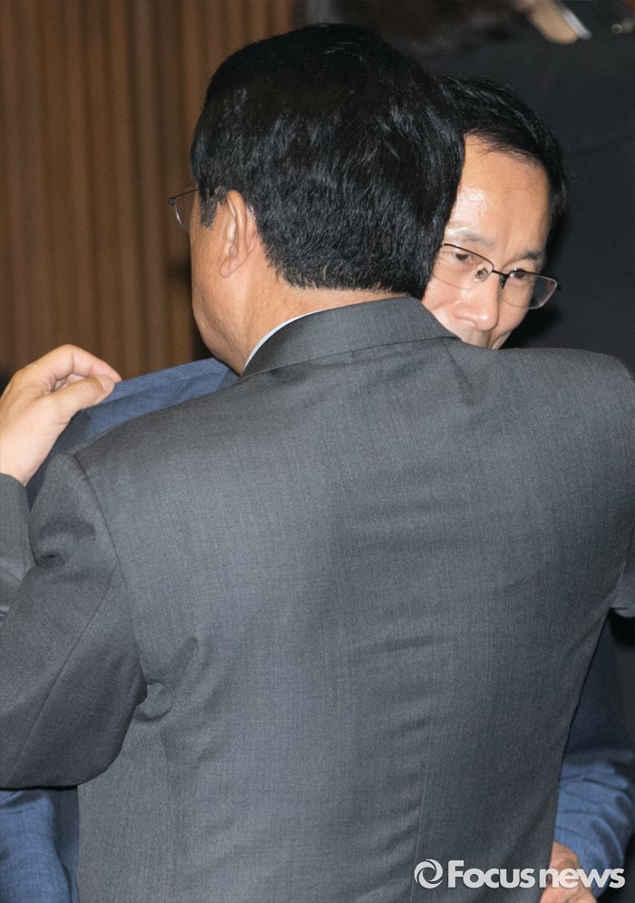 (서울=포커스뉴스) 21일 오전 서울 여의도 국회에서 열린 343회 국회(임시회) 4차 본회의에 참석한 정진석(왼쪽) 새누리당 원내대표와 최정호 국토교통부 2차관이 대화하고 있다.