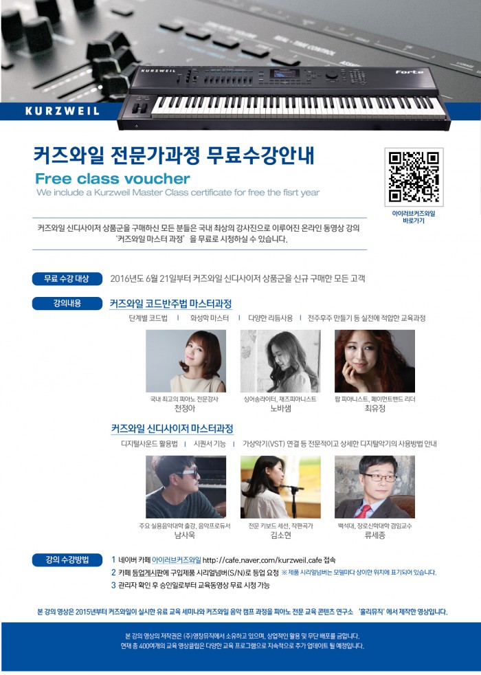 강의엔 국내 대표 피아노 교육 서적의 저자이자 유명 강사인 천정아, 백석대학 실용음악 겸임 교수인 류세종, 음악프로듀서 남사욱 등 스타 강사진 6인이 참여했다. 지난해부터 실시한 커즈 와일 유료 세미나 과정과 여름 음악 캠프 영상 등 고급 과정도 모두 포함됐다.
