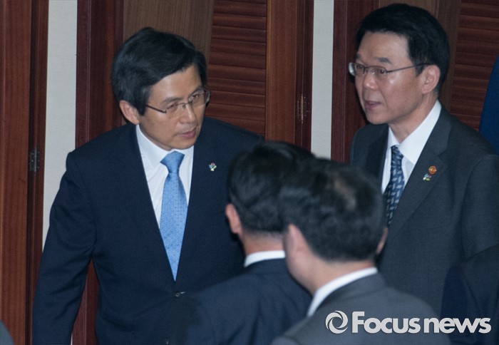 (서울=포커스뉴스) 21일 오전 서울 여의도 국회에서 열린 343회 국회(임시회) 4차 본회의에 참석한 황교안(왼쪽) 국무총리와 강호인 국토교통부 장관이 대화하며 퇴장하고 있다.
