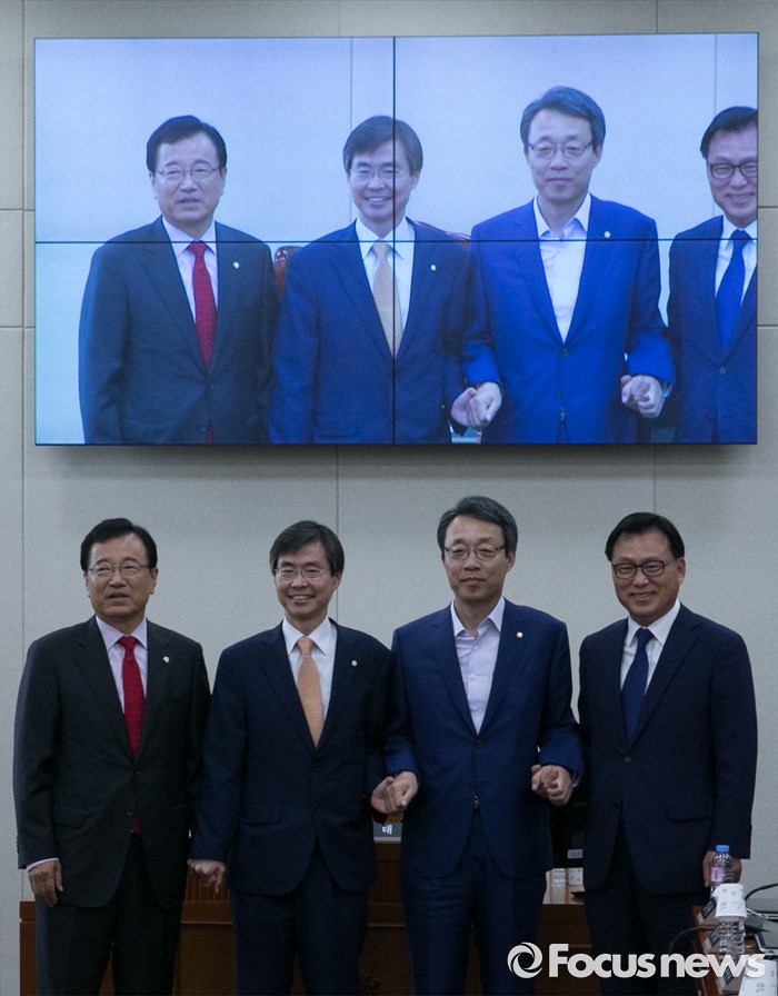 (서울=포커스뉴스) 21일 오전 서울 여의도 국회에서 기획재정위원회 전체회의를 마친 뒤 조경태 위원장 3당 간사가 취재진을 향해 포즈를 취하고 있다. 왼쪽부터 이현재 새누리당 간사, 조 위원장, 김성식 국민의당 간사, 박광온 더불어민주당 간사.