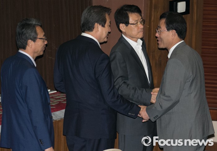 (서울=포커스뉴스) 21일 오전 서울 여의도 국회에서 열린 343회 국회(임시회) 4차 본회의에 참석한 김무성(왼쪽 두번째) 새누리당 전 대표와 주호영 무소속 의원이 인사하고 있다.