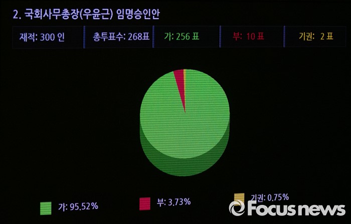 (서울=포커스뉴스) 21일 오전 서울 여의도 국회에서 열린 343회 국회(임시회) 4차 본회의에서 우윤근 국회 사무총장 임명승인안이 재석 268인 중 가결 256표, 부결 10표, 기권 2표로 통과되고 있다.