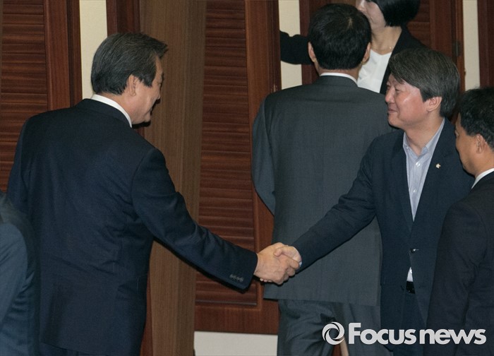 (서울=포커스뉴스) 21일 오전 서울 여의도 국회에서 열린 343회 국회(임시회) 4차 본회의에 참석한 김무성(왼쪽) 새누리당 전 대표와 안철수 국민의당 상임공동대표가 인사하고 있다.