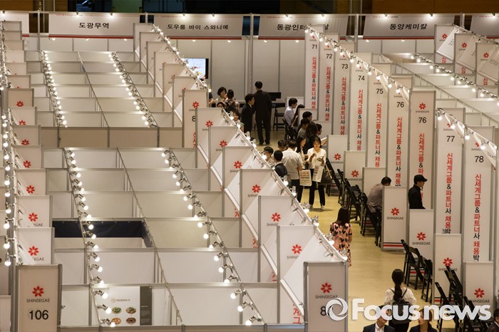 (서울=포커스뉴스) 21일 오후 서울 강남구 코엑스 D2홀에서 열린 신세계그룹&파트너사 채용박람회에서 구직자들이 희망 부스를 둘러보고 있다.
