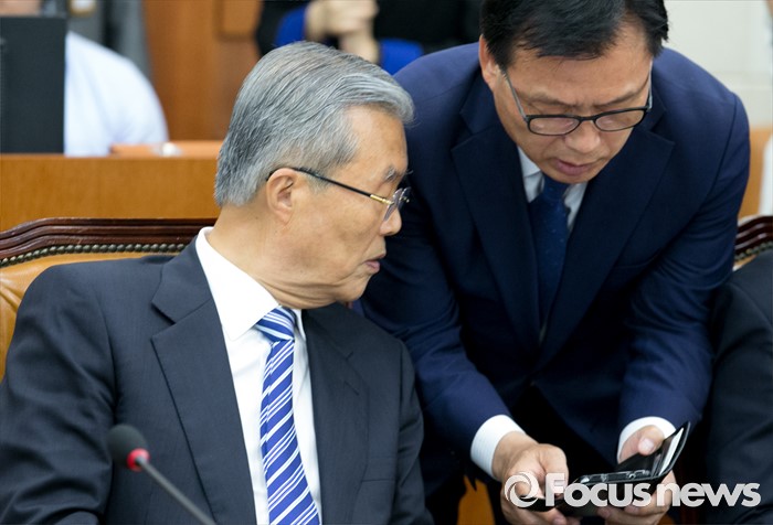 (서울=포커스뉴스) 21일 오전 서울 여의도 국회에서 열린 기획재정위원회 전체회의에 참석한 김종인(왼쪽) 더불어민주당 비대위 대표와 박광온 간사가 대화하고 있다.