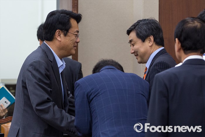 (서울=포커스뉴스) 정진석 국회 국방위원회 새누리당 위원과 이종걸 국회 국방위원회 더불어민주당 위원이 21일 오전 서울 여의도 국회에서 열린 전체회의에 참석해 대화를 나누고 있다.