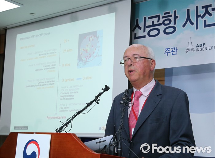 (세종=포커스뉴스) 장 마리 슈발리에 프랑스 파리공항공단자회사 ADPi 수석엔지니어가 21일 오후 세종시 정부세종청사 국토교통부 브리핑실에서 열린 동남권 신공항 타당성 검토 연구 최종 보고회에서 입지선정 결과를 발표하고 있다.