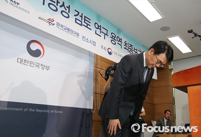 (세종=포커스뉴스) 강호인 국토교통부장과이 21일 오후 세종시 정부세종청사 국토교통부 브리핑실에서 열린 동남권 신공항 타당성 검토 연구 최종 보고회에서 입지선정 결과에 따른 정부입장 발표를 마치고 인사하고 있다.