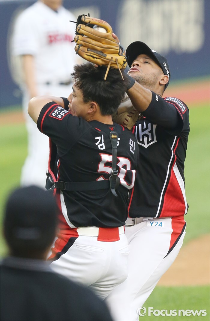 (서울=포커스뉴스) 12일 서울 잠실구장에서 열린 2016 프로야구 kt-두산 경기 2회말 1사 1루에서 kt 포수 김종민과 3루수 마르테가 두산 박세혁의 파울 플라이를 잡으며 충돌하고 있다.