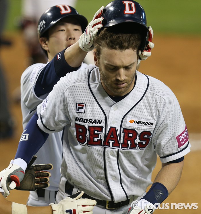 (서울=포커스뉴스) 12일 서울 잠실구장에서 열린 2016 프로야구 kt-두산 경기 4회말 1사후 두산 박건우가 만루홈런을 치고 들어온 에반스의 헬맷을 벗겨 주고 있다.