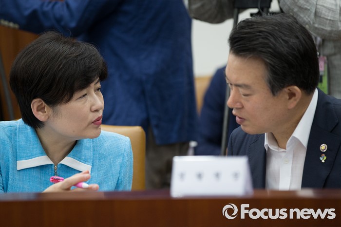 (서울=포커스뉴스) 22일 오전 서울 종로구 정부서울청사에서 열린 '제7차 사회관계장관회의'에 참석한 강은희(왼쪽) 여성가족부 장관과 강신명 경찰청장이 대화하고 있다.