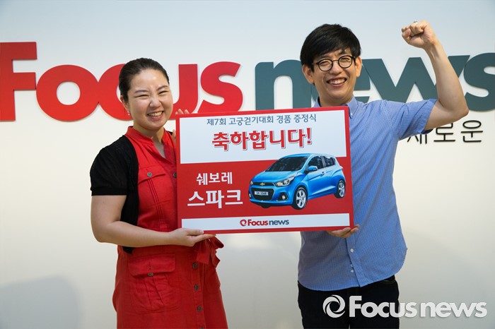 (서울=포커스뉴스) 22일 오전 서울 서초구 포커스뉴스 본사에서 제7회 나라사랑 고궁걷기대회 1등 경품 추첨에 당첨된 이윤옥, 김한준 부부가 경품을 전달받고 기뻐하고 있다.