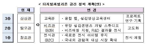이에 미래부는 상암 DMC 누리꿈스퀘어 디지털파빌리온을 우리 기업이 개발하는 실감콘텐츠를 연구하고 테스트해 고도화·상용화 할 수 있는 ‘개방형 연구·전시 공간’으로 재구성할 계획이다.