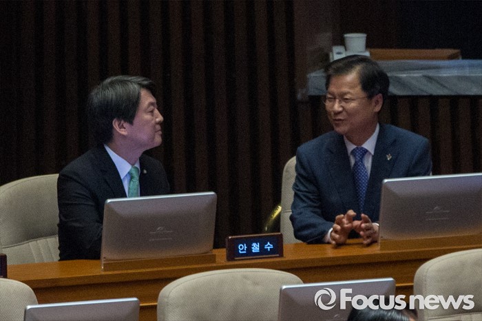 (서울=포커스뉴스) 안철수(왼쪽) 국민의당 상임공동대표와 천정배 국민의당 공동대표가 22일 오전 서울 여의도 국회에서 열린 본회의에 참석해 대화 나누고 있다.