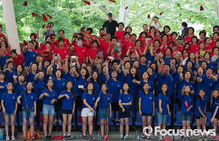 (서울=포커스뉴스) 22일 오전 서울 송파구 서울놀이마당에서 열린 '통일대합창, 625명이 함께하는 평화공감' 행사에 참가한 송파구민들이 합창을 마치고 종이비행기를 날리고 있다. 이번 행사는 관내 합창단과 노래동아리 등 송파구민 1000여명이 신청해 2주전부터 개별적으로 연습 한 후 통일대합창에 참가 했다.