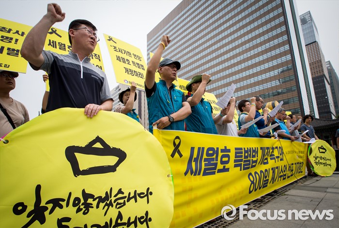 (서울=포커스뉴스) 세월호 참사 800일을 하루 앞둔 22일 오전 서울 종로구 광화문 광장에서 열린 '세월호 특별법 개정 촉구와 800일 계기수업 선포' 기자회견에 참석한 전국교직원노동조합 조합원들이 구호를 외치고 있다.