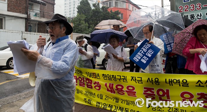 (서울=포커스뉴스) 22일 오후 서울 중구 신당동 김종필 전 총리 자택 앞에서 일제 강제동원희생자유가족협동조합 및 아시아태평양 전쟁희생자 한국유족회 회원들이 '한일협정 당시 일본외상 오히라 와 메모로 합의한 역사의 진실을 밝힐 것'을 촉구하고 있다.